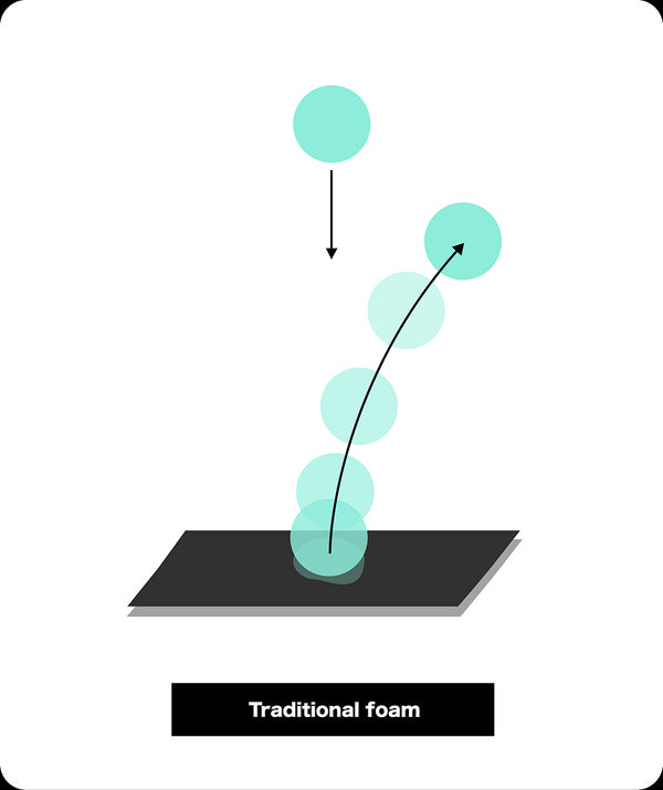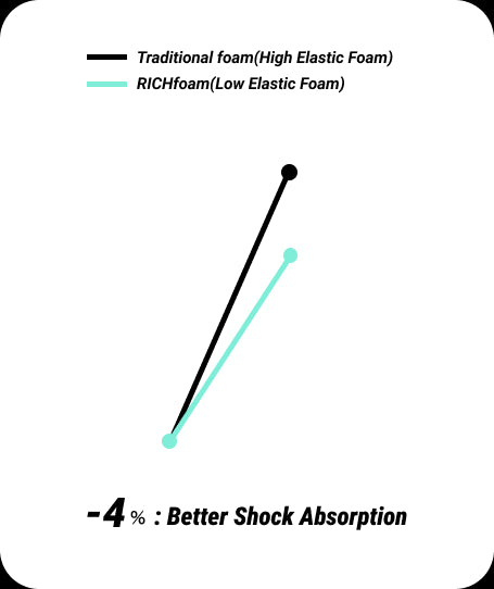 「低硬度低弾性」クッションです。RICHfoamは一般的な靴のクッションよりも 32%優れた衝撃吸収力と65%向上したエネルギー吸収力があります。